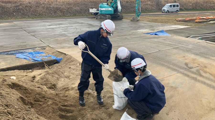 建設業および弊社の会社説明の後、輪止め作りや土嚢袋作り、建設機械の体験などを行いました。